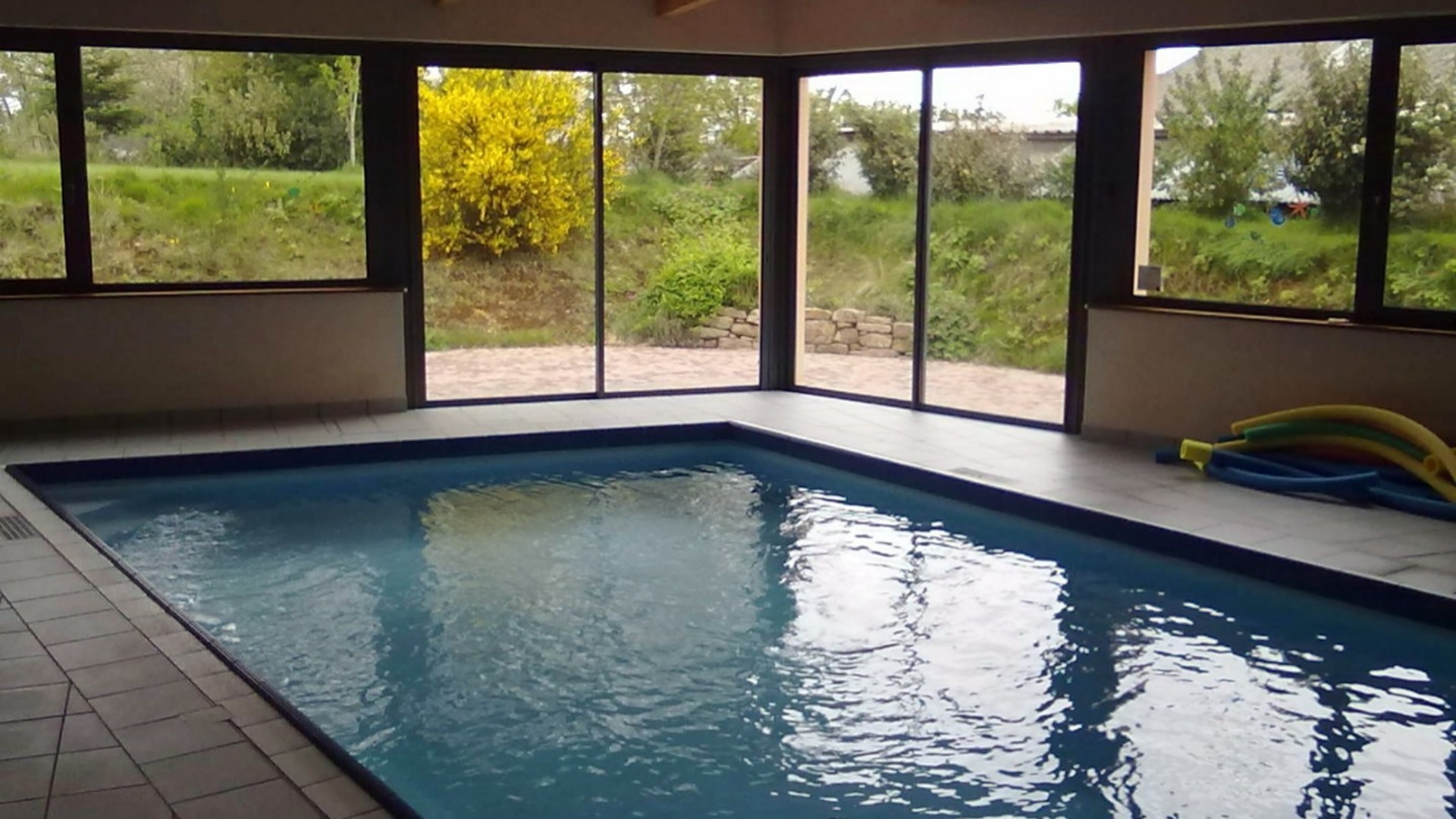 grande piscine indoor + sauna, vestiaires, sanitaires douches, wc, local technique.